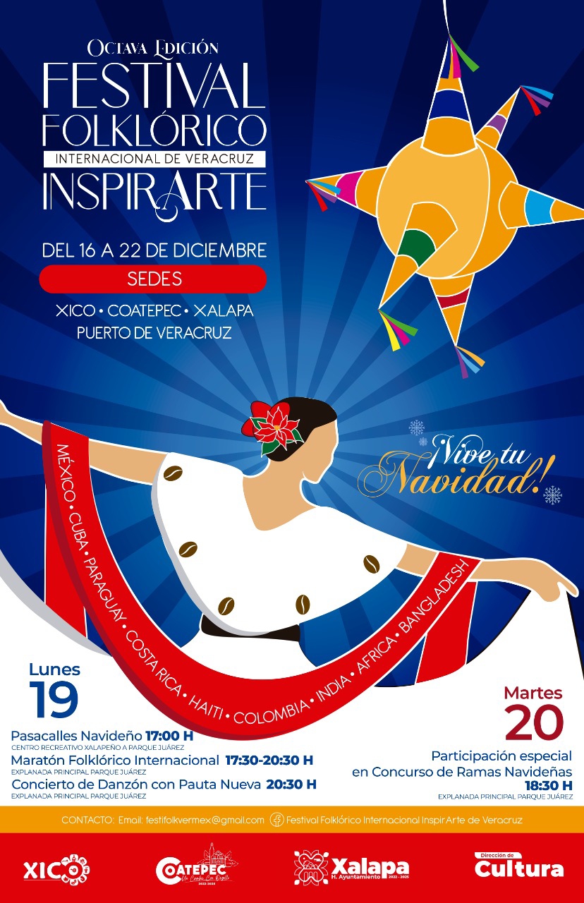 En el marco del Festival Folklórico Internacional de Veracruz, Inspirarte, este lunes a las 17:00 horas se desarrollará un Pasacalles Navideño del Centro Recreativo Xalapeño (CRX) al parque Benito Juárez, sitio donde a las 17:30 horas se realizará un maratón folclórico y un concierto de danzón, a las 20:30 horas, a cargo de la Orquesta Municipal de Xalapa.