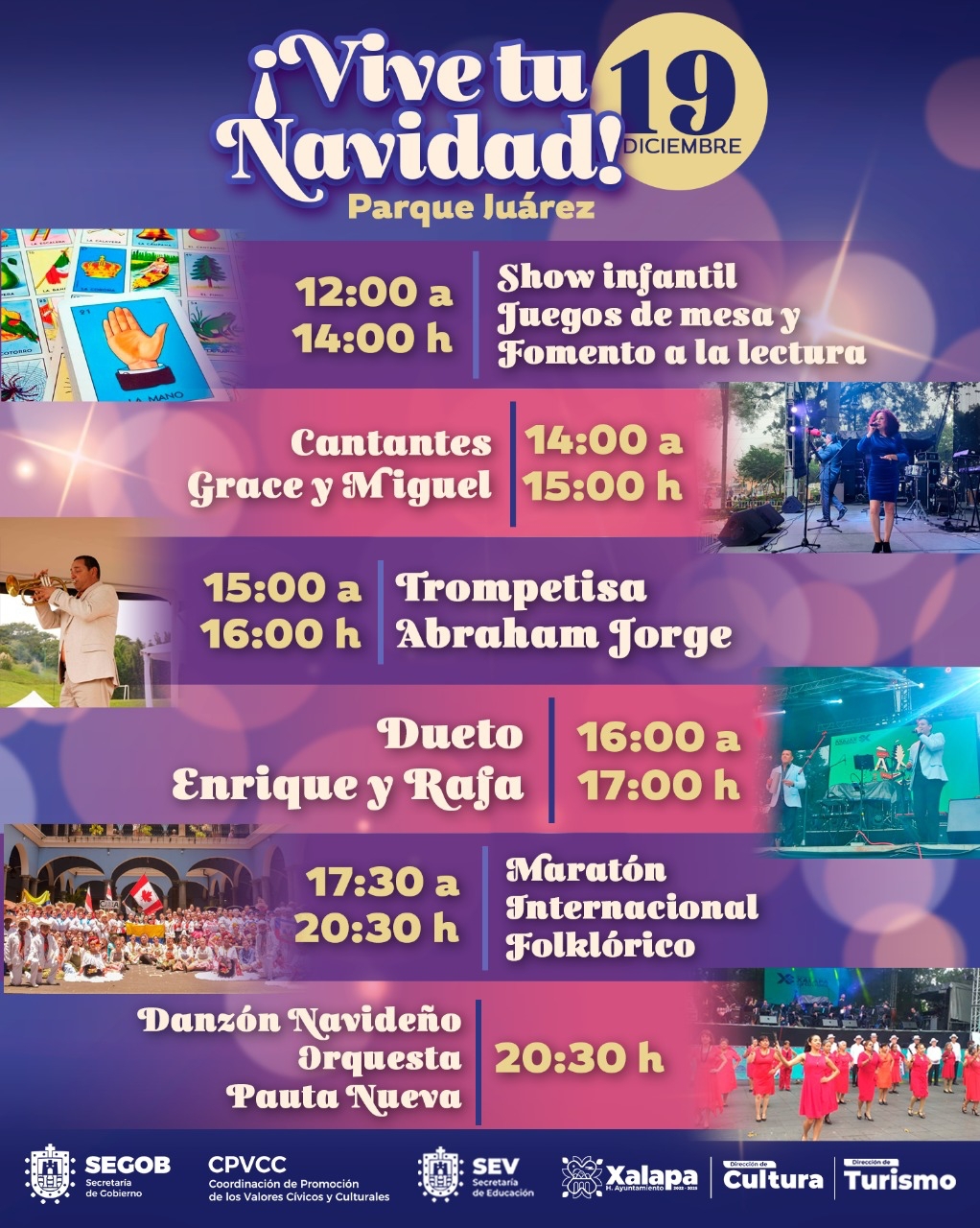 A las 14:00 se proyectará la película El Inocente; a las 16:00 horas se presentan los cantantes Gema y Ricardo Juárez, y a las 17:00 horas, el coro Alegría Xalapeña. A las 18:00 horas inicia el concurso de Ramas Navideñas y a las 20:30 horas se clausura el evento con el grupo artístico de la SEV, Pájaro Cu.