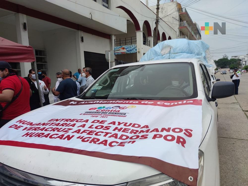 Coatzacoalcos, Ver.- El Ayuntamiento de Coatzacoalcos recibió la mañana de este jueves un donativo por parte del gobierno municipal de Centla, perteneciente al vecino estado de Tabasco, de alimentos y artículos de higiene personal en apoyo a las familias afectadas en el norte de Veracruz tras el paso del huracán Grace.