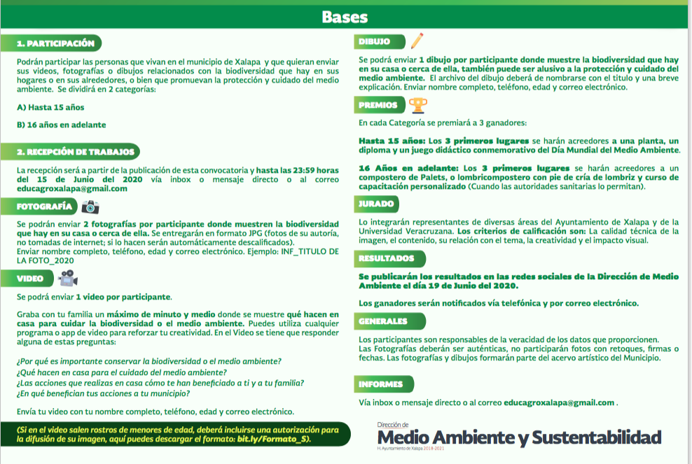 De esta manera y a través de dibujos, fotos o videos se identificará y reconocerán las prácticas para conservar y proteger la biodiversidad y el medio ambiente que tiene cada uno de los ciudadanos en la capital del estado. La recepción de trabajos inicia desde este viernes y hasta el 15 de junio en la cuenta de correo educagroxalapa@gmail.com
