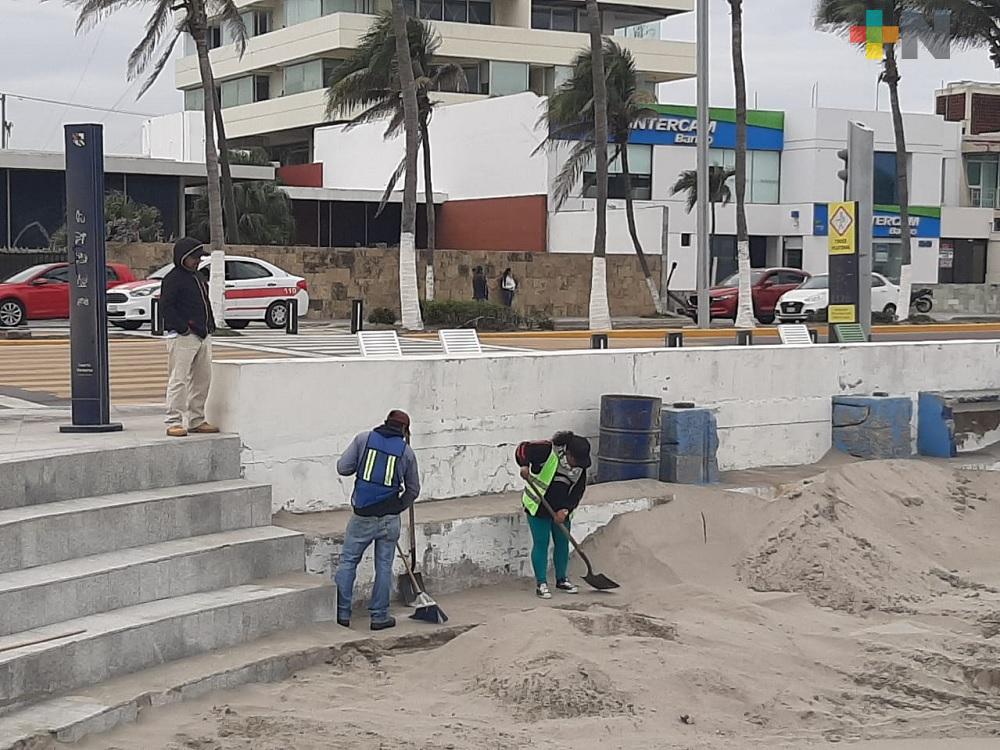 Veracruz, Ver.- Desde muy temprana hora de este jueves, el personal de Limpia Pública del ayuntamiento de Veracruz comenzó con labores de limpieza en el bulevar costero Manuel Ávila Camacho, pues los fuertes vientos que superaron los 100 kilómetros por hora del sistema frontal número 23, ocasionó que la arena de la playa saliera hacia el bulevar, acumulándose al pie del muro de contención y de las banquetas.