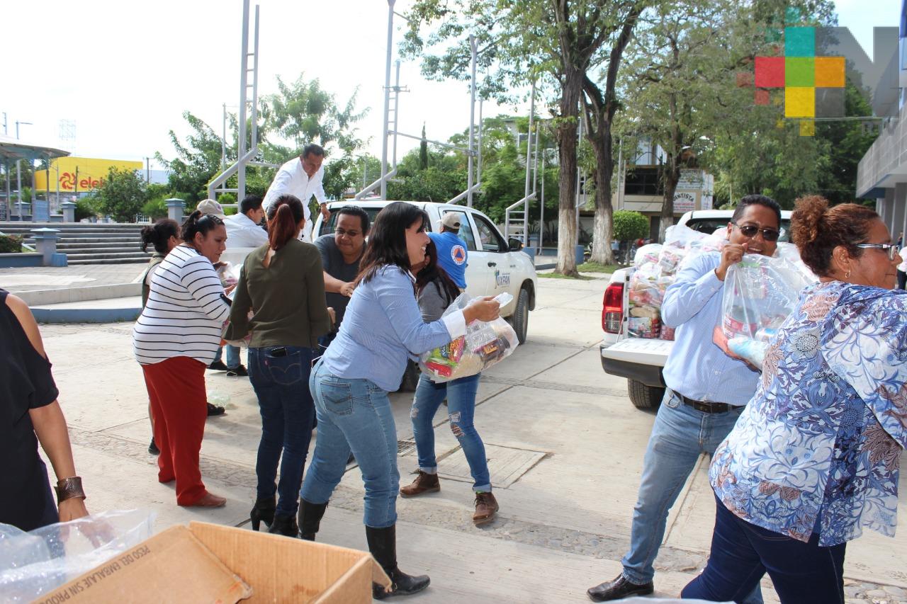 Mano a mano y codo a codo, las autoridades de ambos municipios descargaron los paquetes alimenticios, que serán distribuidos en 31 colonias y 15 comunidades consideradas zona de desastre por el desbordamiento de un arroyo y un estero.