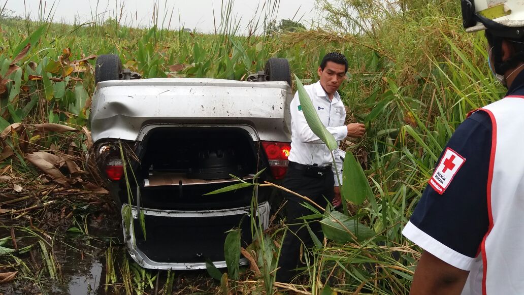 Coatzacoalcos, Ver., 27 de febrero de 2017.– Esta mañana las malas condiciones de la carretera Minatitlán-Coatzacoalcos provocaron la volcadura de un vehículo particular a la altura del tramo conocido como Las Matas. La unidad se salió de su carril y terminó sobre el pantano con los neumáticos hacia arriba.