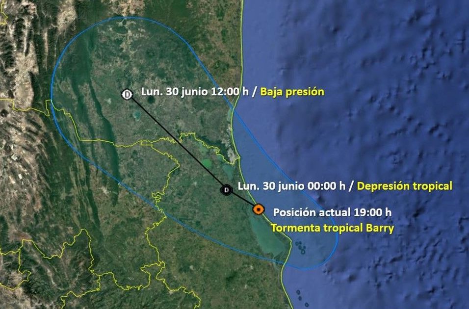 Se prevé que, en las próximas horas, «Barry» se degrade a una baja presión remanente sobre el norte de Veracruz, sur de Tamaulipas y oriente de San Luis Potosí, manteniendo el potencial de lluvias sobre dichos estados.