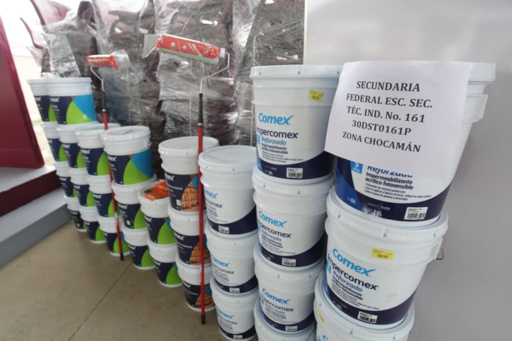 La entrega incluyó mil 245 cubetas de pintura, 950 de impermeabilizante, 3 mil 948 sillas para mesa trapezoidal, mil 974 mesas trapezoidales, 340 pizarrones y 61 pantallas, destinados a 62 primarias, 10 secundarias federales y 16 telesecundarias.