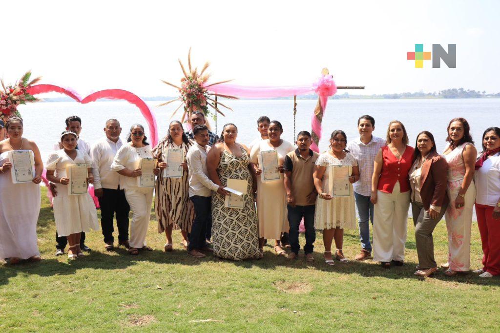Chacaltianguis, Ver.- En un escenario natural que evoca identidad, historia y sustento económico para sus habitantes, más de 15 parejas formalizaron su unión civil en la emblemática Laguna de Lagartos, un espacio que, además de su riqueza paisajística, constituye una fuente tradicional de alimento y actividad comercial para la comunidad.