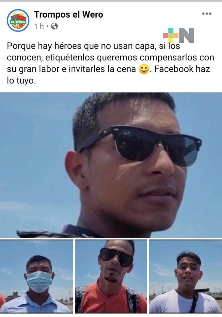 Coatzacoalcos, Ver.- Al menos tres negociaciones dedicados a la venta de comida, buscan reconocer y recompensar con descuentos especiales y alimentos gratis, la solidaridad de los tres jóvenes de origen hondureño y un elemento activo de la policía estatal que lograron rescatar con vida a tres miembros de una familia que estuvieron a punto de morir ahogados en las aguas del Golfo de México.