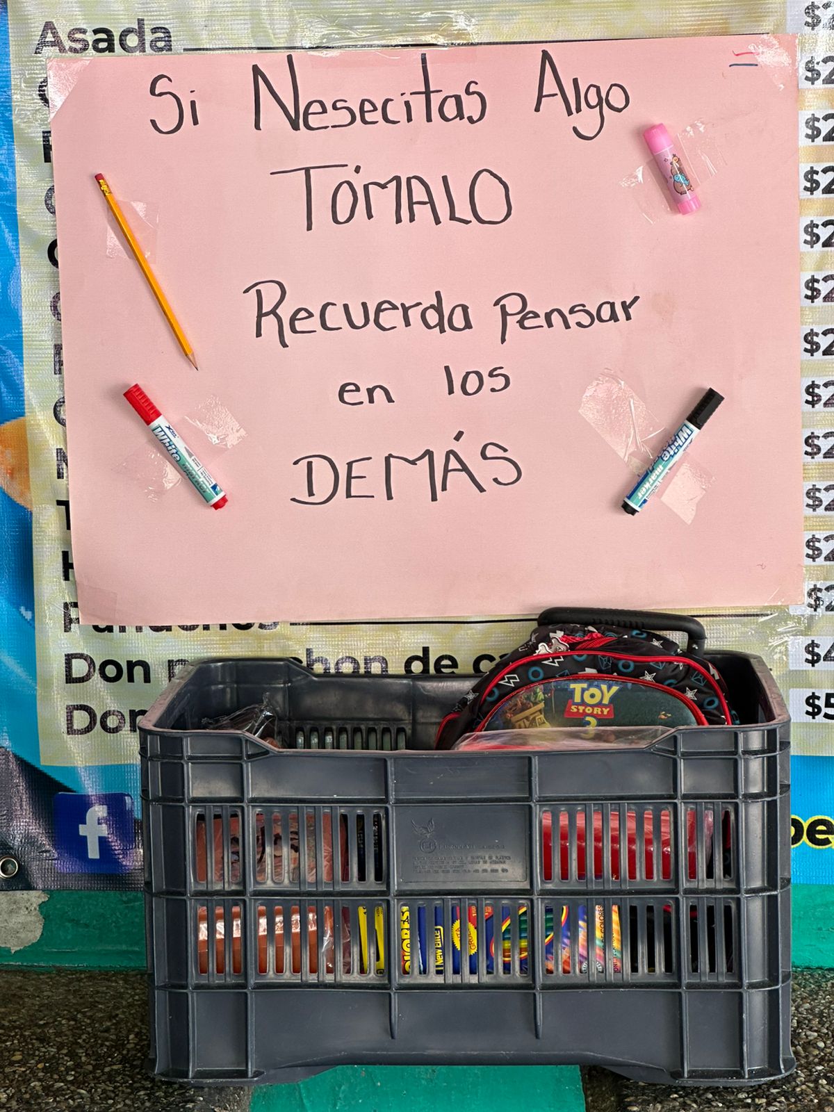 Con el mensaje “Si necesitas algo, tómalo”, han colocado una reja con varios artículos escolares, donde las personas que necesiten de alguno de estos artículos pueden tomarlos, como explicó Germán Juárez, trabajador del comercio.