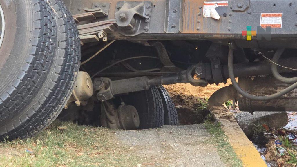 Camión con gravilla cae en socavón de una banqueta en Coatzacoalcos