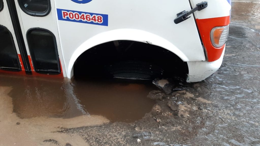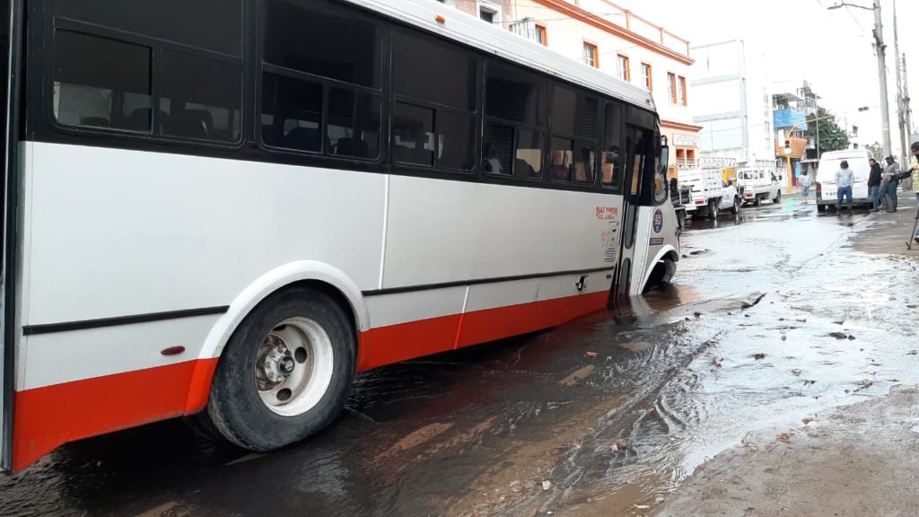 Veracruz, Ver.- Un camión urbano que se trasladaba por el centro histórico de Veracruz, cayó en un hundimiento que se generó sobre la avenida Madero a consecuencia de una megafuga de agua potable.