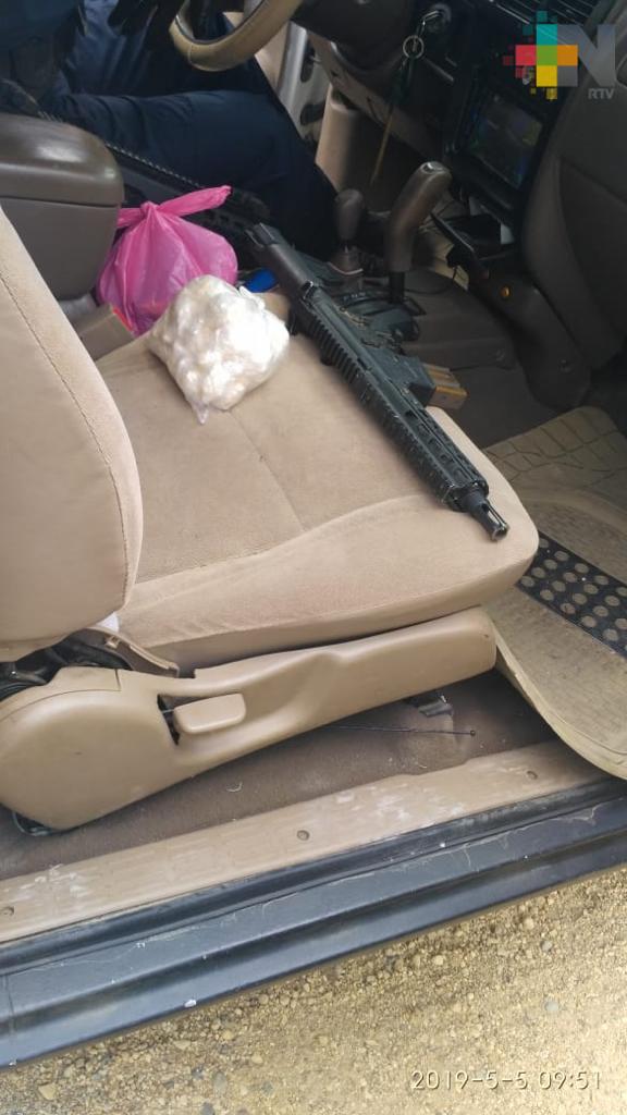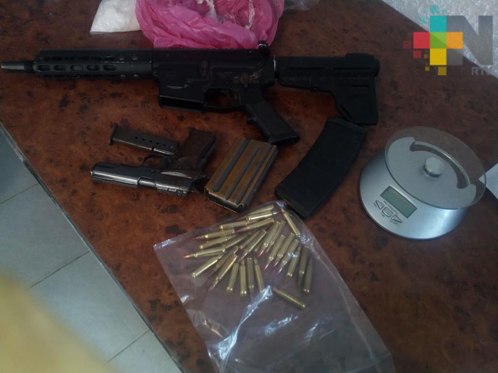 Al detenido, le fueron además asegurados: 29 envoltorios con cuadros blancos, al parecer cristal; 15 cuadritos envueltos, también al parecer de cristal; una bolsa con una sustancia desconocida de 500 gramos aproximadamente; una báscula sin marca; un celular negro moto g5; un arma corta con numeración 707892, marca Llama, calibre 380; un cargador abastecido con un solo cartucho; un arma larga mod. ST15, sin matrícula, con dos cargadores (uno de color negro plástico y otro metálico) y 28 cartuchos calibre 223; así como un arma corta marca Colt.