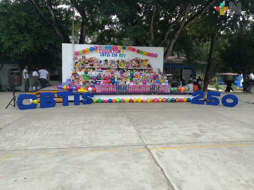 Coatzacoalcos, Ver.- Alumnos del Centro de Bachillerato Tecnológico Industrial y de Servicios (CBTIS) 250 de Chinameca, se sumaron a la campaña de recolección de juguetes «Más Sonrisas» de Radiotelevisión de Veracruz (RTV), delegación Coatzacoalcos.