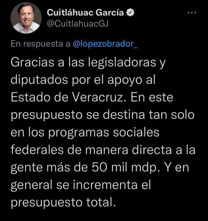 «Gracias a las legisladoras y diputados por el apoyo al Estado de Veracruz. En este presupuesto se destina tan solo en los programas sociales federales de manera directa a la gente más de 50 mil mdp. Y en general se incrementa el presupuesto total».