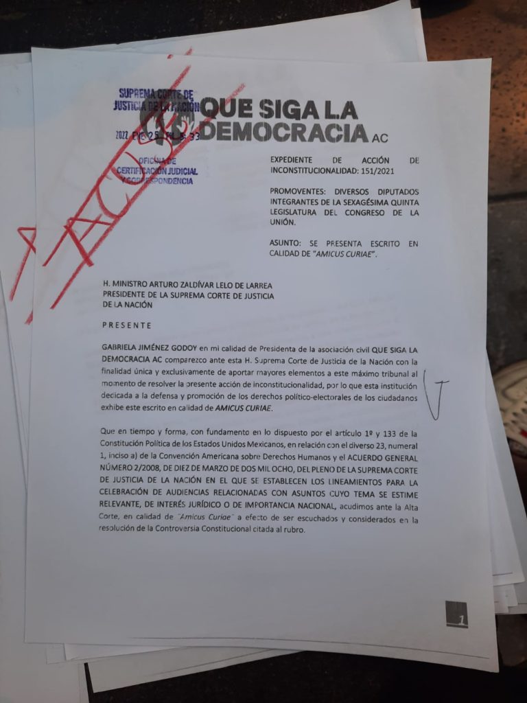 Detalló que el recurso Amicus Curiae que presentó ante la Corte se hizo con la finalidad de aportar mayores elementos al máximo tribunal al momento de resolver la acción de inconstitucionalidad 151/2021 promovida por legisladores de oposición.