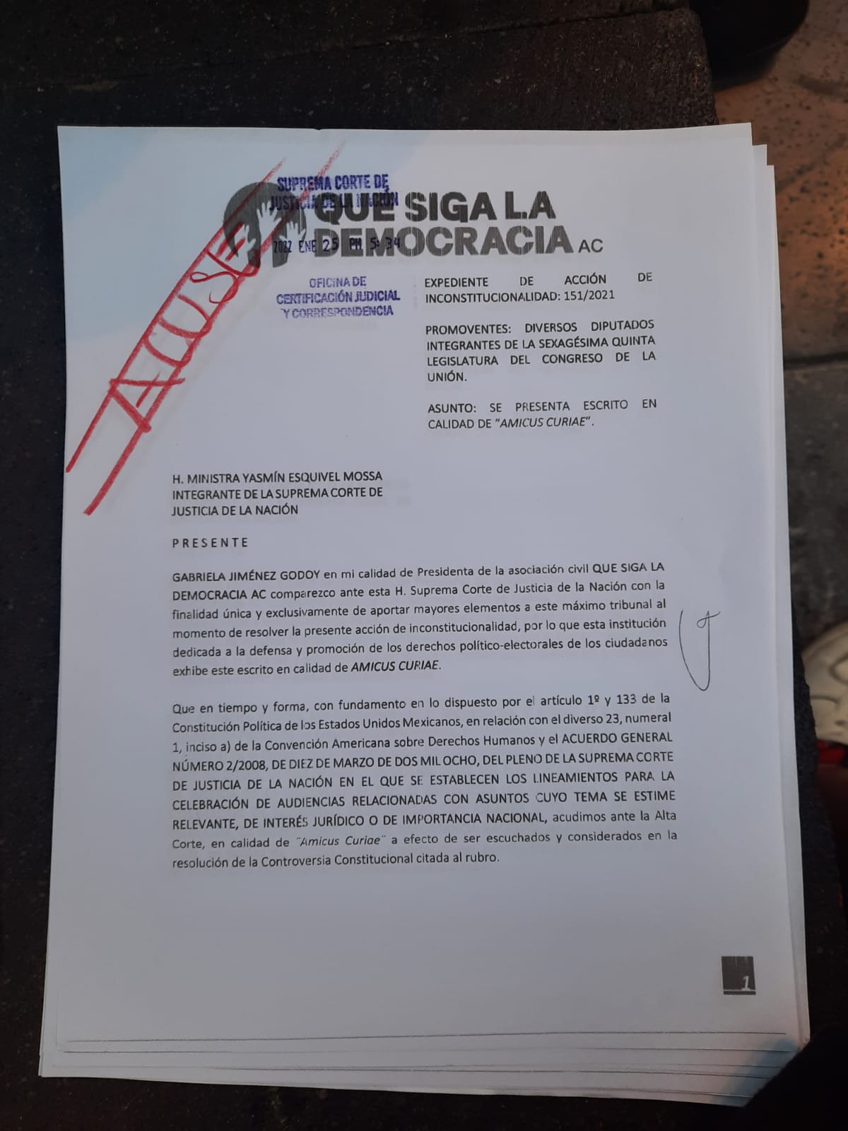 Detalló que el recurso Amicus Curiae que presentó ante la Corte se hizo con la finalidad de aportar mayores elementos al máximo tribunal al momento de resolver la acción de inconstitucionalidad 151/2021 promovida por legisladores de oposición.