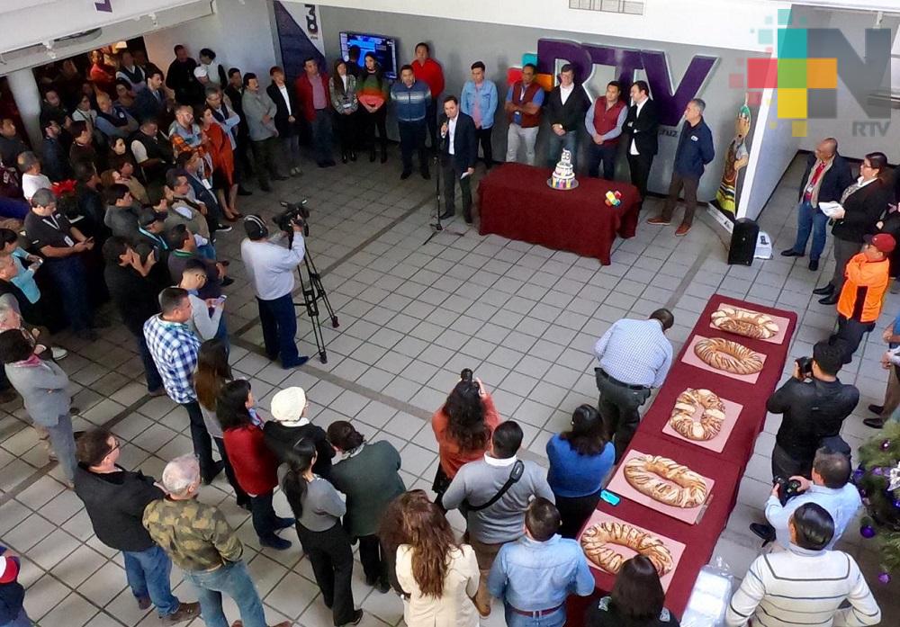 El sencillo acto de celebración fue realizado en el lobby de RTV en donde además directivos y trabajadores partieron la tradicional Rosca de Reyes.