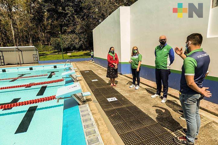Xalapa, Ver.- Las actividades en el Centro Acuático Universitario “Eulalio Ríos”, de la Universidad Veracruzana (UV), fueron reabiertas a partir de este lunes bajo estrictas medidas sanitarias y de sana distancia, hecho que constató personalmente la rectora Sara Ladrón de Guevara.