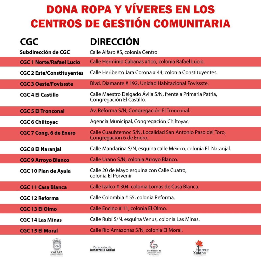 Xalapa, Ver.- En los 15 Centros de Gestión Comunitaria (CGC), se instalaron puntos de acopio de víveres, ropa y apoyos para la población que resultó afectada por el paso del huracán Grace, informó el subdirector de Centros de Gestión Comunitaria de Xalapa, Jorge Luis Alarcón Contreras.