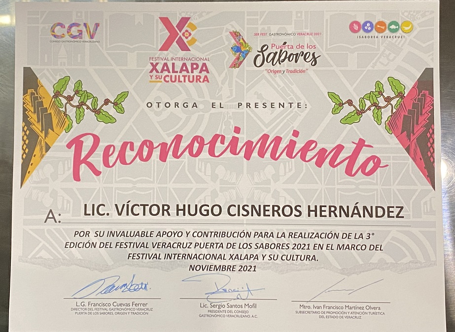 En el evento, el director del Festival Gastronómico Veracruz Puerta de los Sabores, Origen y Tradición, Francisco Cuevas Ferrer y el presidente del CGV, Sergio Santos Mofil entregaron al titular de RTV, Víctor Hugo Cisneros; una medalla conmemorativa, una filipina de chef, un reconocimiento impreso y un trofeo alusivo a una cuchara de cocina.