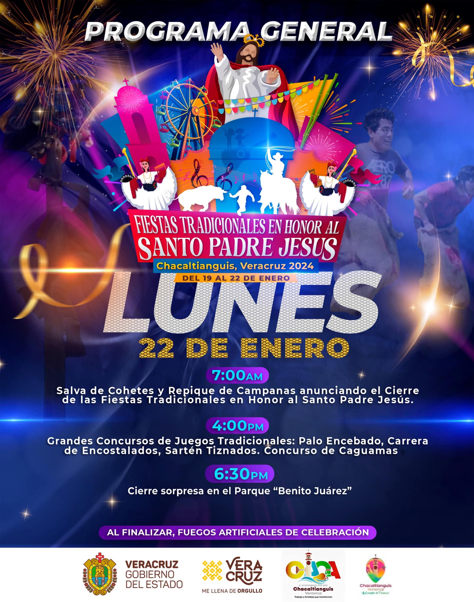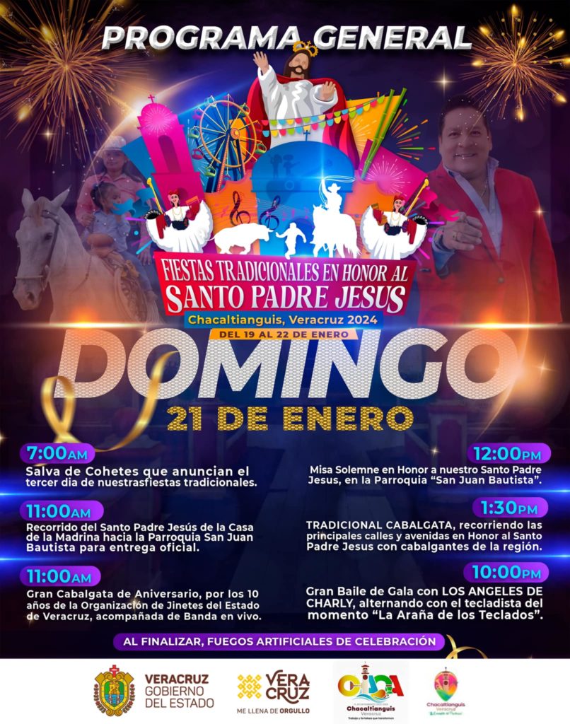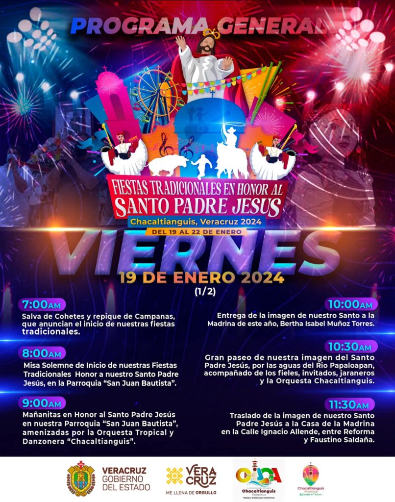 El viernes 19 de enero se dará salva de cuetes y campanadas en el templo de San Juan Bautista, misa solemne, mañanitas, procesión y paseo de la venerada figura del Santo Padre Jesús por aguas del Papaloapan, frente a Chacaltianguis, lo que generará una suspensión del servicio de transporte en lancha de Chacaltianguis a Excarolina, municipio de Cosamaloapan.