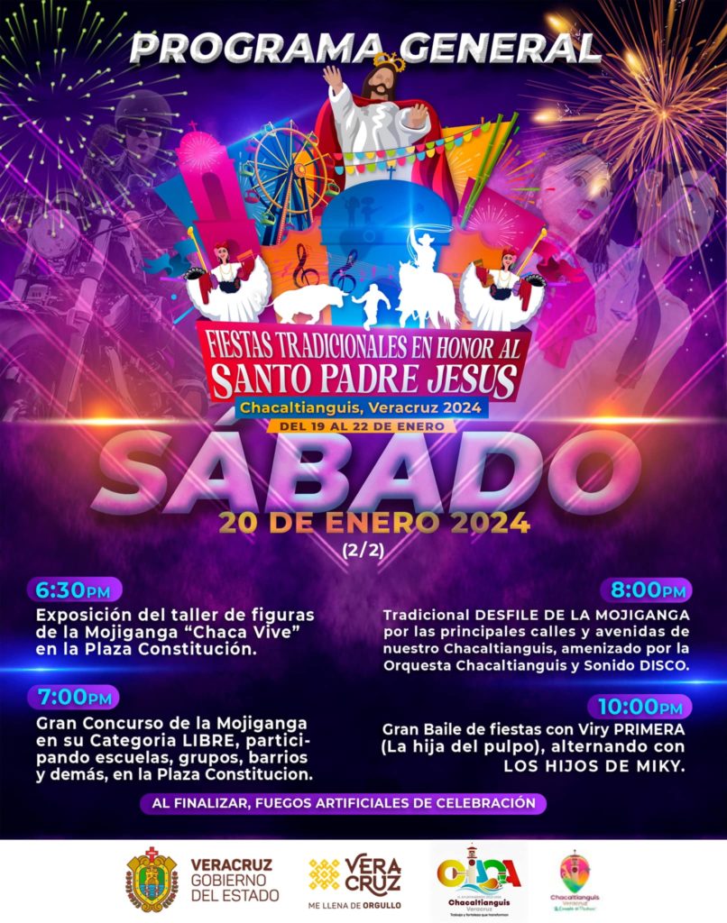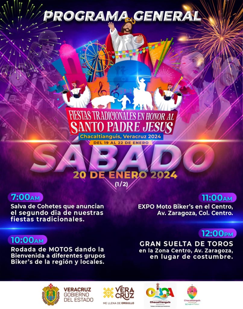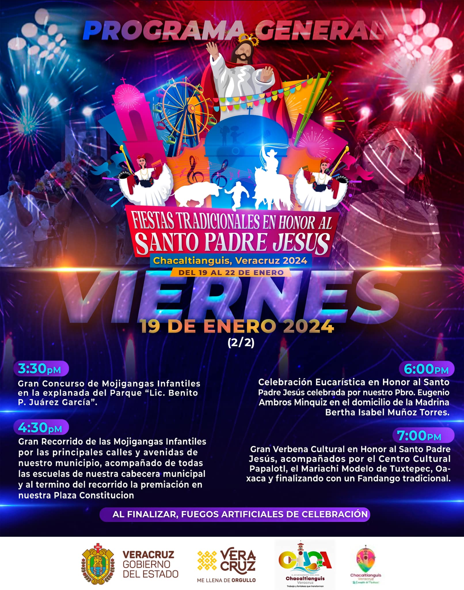 El sábado 20 de enero es el evento de suelta de toros en céntrica calle de Chacaltianguis, para lo que se formó y comité especial para el cuidado de semovientes, mientras que cualquier agresión a los mismos, o a las personas supondrá un ingreso a las arcas municipales de al menos 15 mil pesos por cada multa, y ya el domingo 21 se dará misa solemne que oficiará el obispo de San Andrés Tuxtla, para lo cual, previamente, la figura del Santo Padre Jesús partirá del domicilio de la alcaldesa Bertha Muñoz Torres a la parroquia de San Juan Bautista, y ya el 22 del presente se darán eventos deportivos y la clausura de la fiesta.