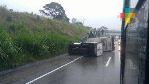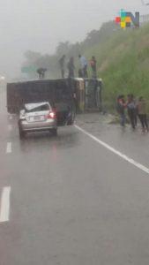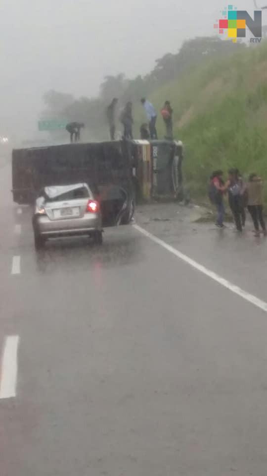 Orizaba, Ver.- Un autobús de la ruta Dos Ríos con número económico 68 que cubre la ruta a la ciudad de Orizaba, al parecer chocó contra una camioneta en la autopista Córdoba-Orizaba, volcando ambas unidades y dañando una más, hechos sucedidos en medio de las malas condiciones del clima la tarde de este miércoles.