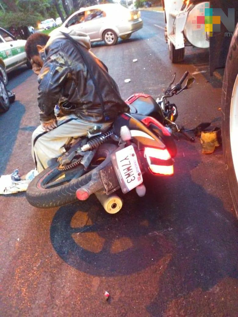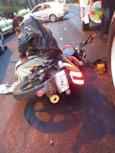 Xalapa, Ver.- El choque entre un motociclista y un vehículo particular además de una revolvedora en la avenida Lázaro Cárdenas a la altura de la Plaza Ánimas provocó embotellamiento en el carril que conduce de Veracruz a Xalapa.
