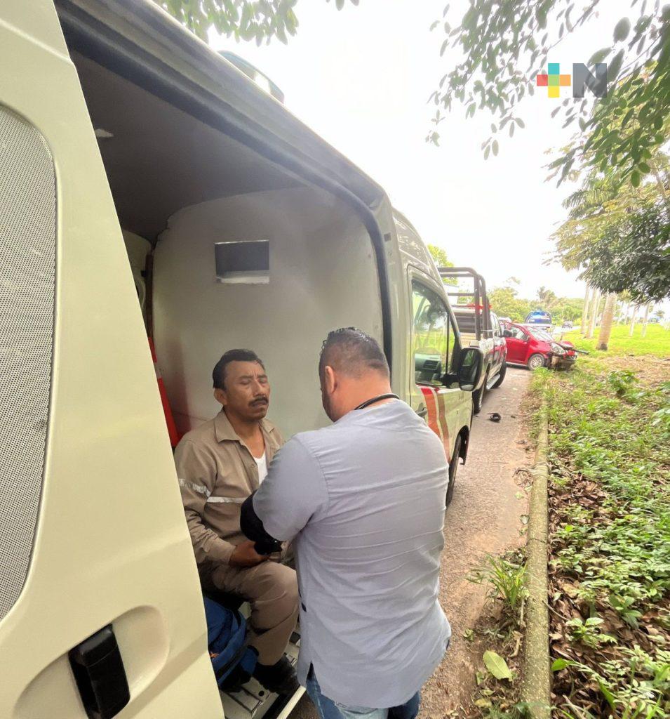 Paramédicos de Protección Civil de Cosoleacaque acudieron al lugar del accidente para dar los primeros auxilios al conductor del vehículo Nissan el cual presenta una fractura en las costillas izquierdas.