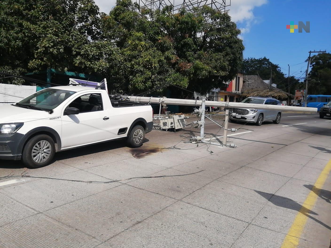 Veracruz, Ver.- El choque entre un camión urbano y una camioneta provocó la caída de un poste de energía eléctrica en el bulevar Miguel Alemán de Boca del Río, lo que provocó que los vecinos de la cabecera municipal se quedaran sin luz.