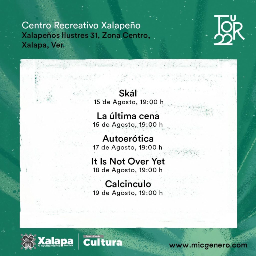 Xalapa, Ver.- Un amplio abanico de actividades artísticas, musicales y culturales ofrece el ayuntamiento de Xalapa a través de la Dirección de Cultura durante esta tercera semana del mes en diversos espacios públicos.