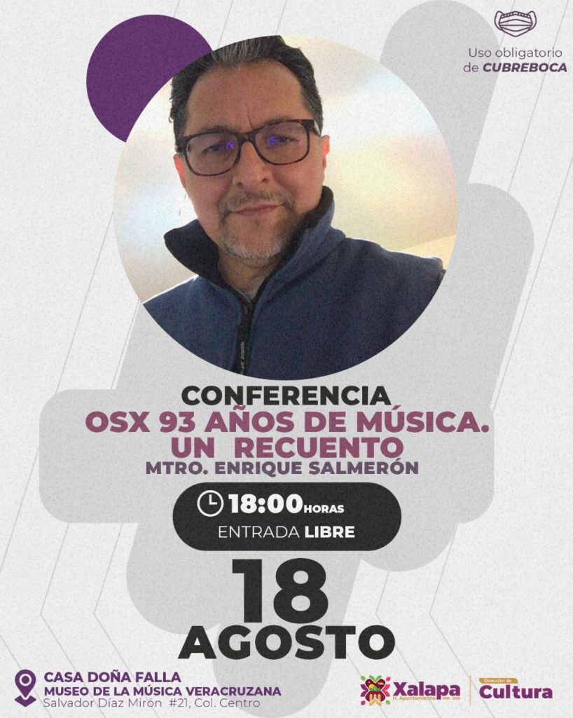 El 18 de agosto, a las 18:00 horas, en el Museo de la Música Veracruzana, Casa Doña Falla, Enrique Salmerón impartirá la Conferencia “OSX, 93 Años de Música. Un recuento”; ese mismo día y el 19 de agosto a las 19:00 horas, en el Teatro J.J. Herrera, se presentará la obra “La Cena”, escrita por Vicente Permar y dirigida por Víctor M. Flores.