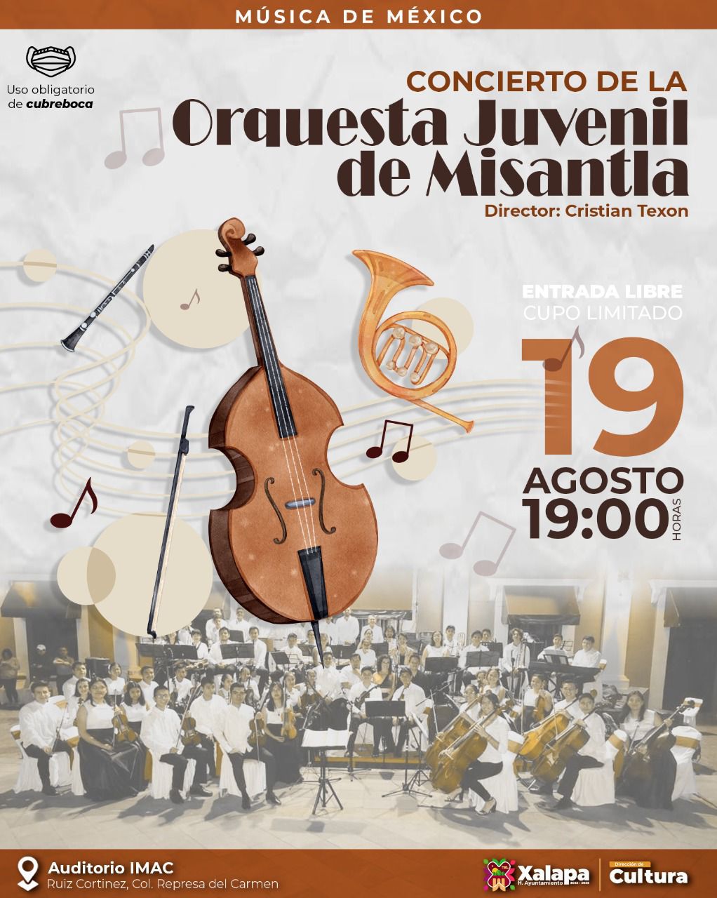 El 19 de agosto, a las 19:00 horas, en el Auditorio de la IMAC, la Orquesta Juvenil de Misantla, bajo la dirección de Cristián Texon, ofrecerá un concierto de música de México. El 20 de agosto, el Cuarteto de la Maza ofrecerá un recital a las 17:00 horas en la Casa Doña Falla. Ese día y el 21 de agosto, a las 20:00 horas y 19:30 horas, respectivamente, el cantante Daniel Núñez ofrecerá el concierto “Recordando a José José: Música de ayer, hoy y siempre”, en el Centro Recreativo Xalapeño.