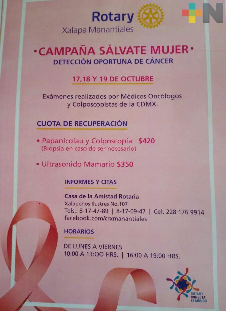 Xalapa, Ver.- Como cada año, en octubre, mes de la lucha contra el cáncer, el Club Rotario Xalapa Manantiales llevará a cabo la campaña “Sálvate mujer” del 17 al 19 de octubre.