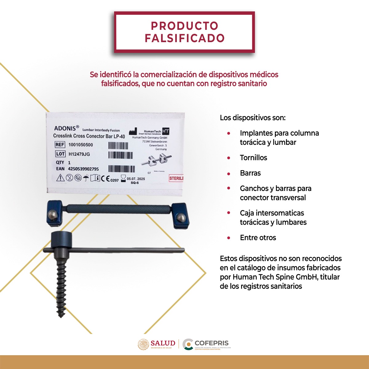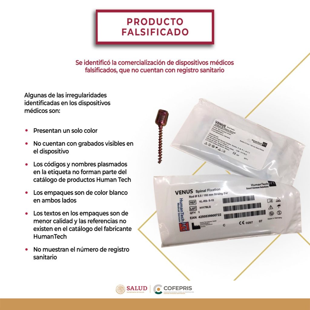 Ciudad de México.- La Comisión Federal para la Protección contra Riesgos Sanitarios (Cofepris) informa a personal de salud, distribuidores y farmacias del sistema público y privado, sobre la falsificación de ocho tipos de dispositivos médicos de la marca Human Tech Spine GmbH.