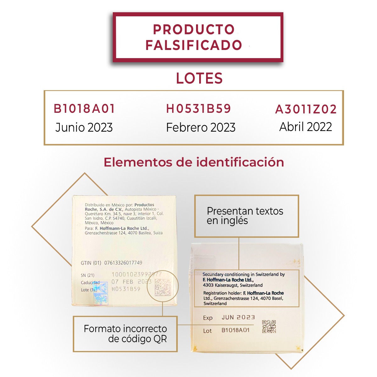La falsificación del tratamiento Ocrevus corresponde a los lotes B1018A01, H0531B59 y A3011Z02, los cuales ostentan fecha de caducidad de junio 2023, febrero 2023 y abril 2022 y no son reconocidos por Laboratorios Roche. Además de las denominaciones mencionadas, los productos irregulares presentan textos en idioma inglés y formato incorrecto de código QR.