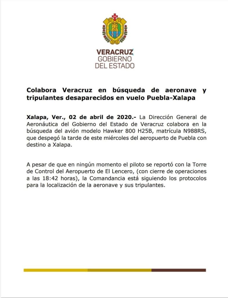 A pesar de que en ningún momento el piloto se reportó con la Torre de Control del Aeropuerto de El Lencero, (con cierre de operaciones a las 18:42 horas), la Comandancia está siguiendo los protocolos para la localización de la aeronave y sus tripulantes.