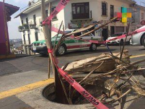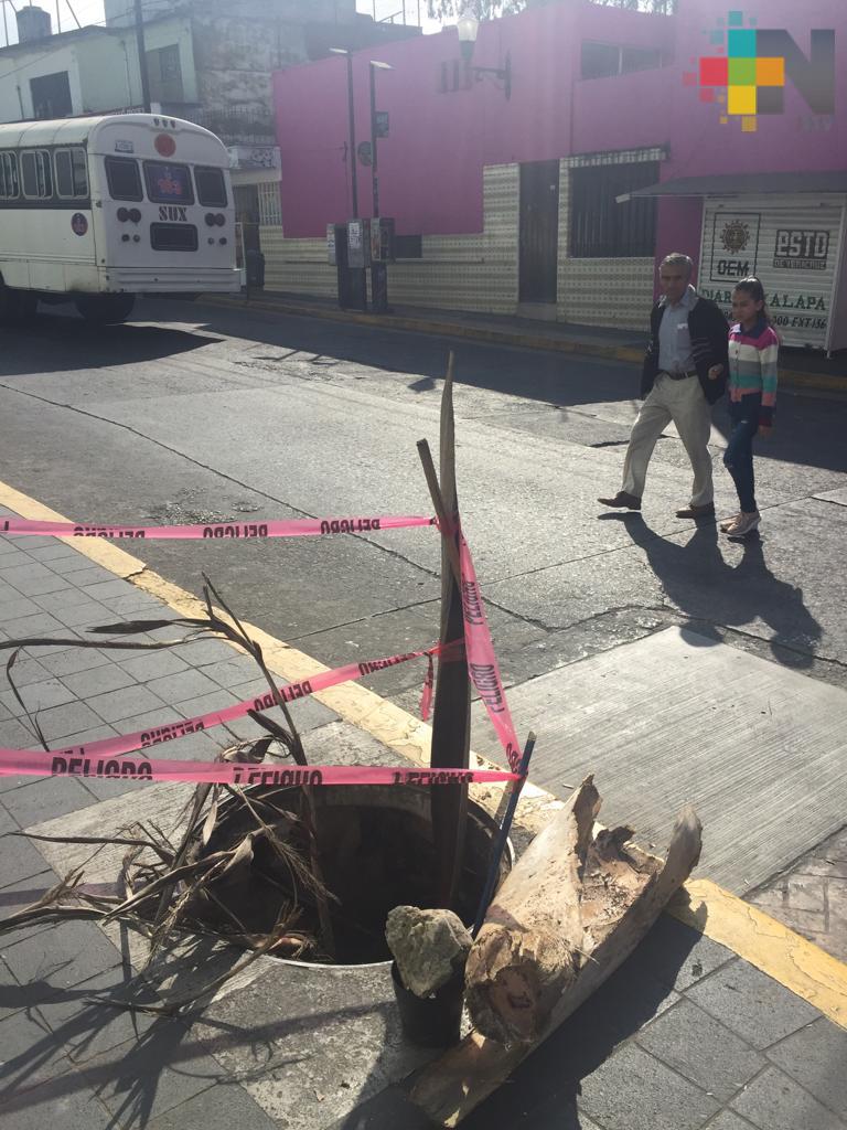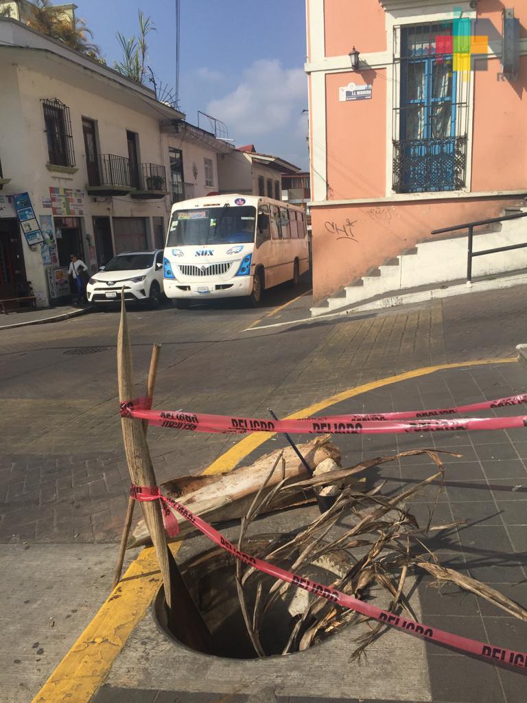 Usuarios en redes sociales reportan esta coladera sin tapa sobre la banqueta de la calle Allende, casi esquina con José Joaquín Herrera en pleno centro de Xalapa. Señalan un peligro para transeúntes y vecinos de la zona, coloraron cinta peligro, algunas ramas secas y palos para alertar a quienes caminen por la zona.