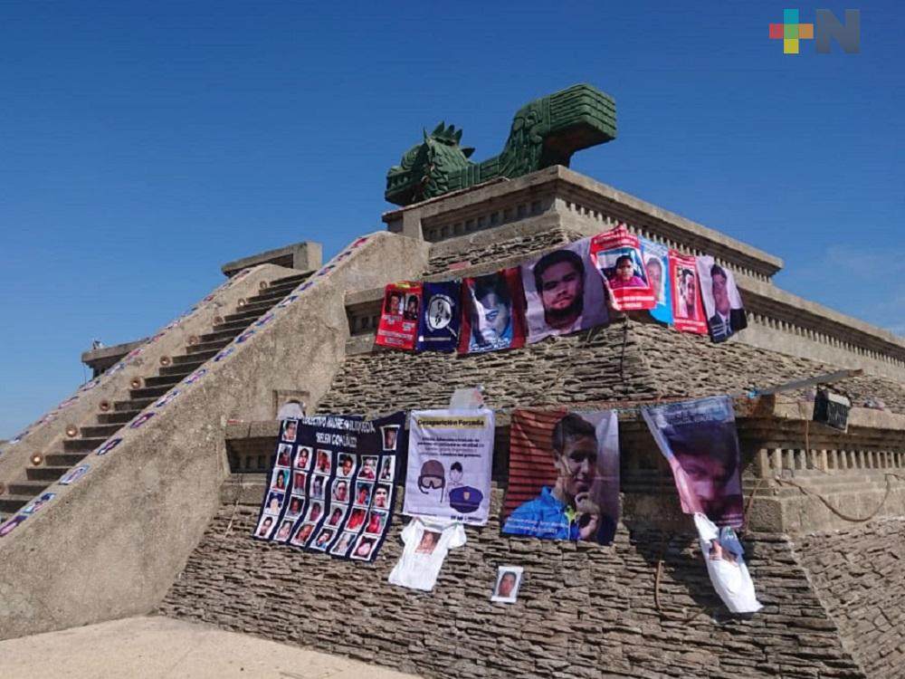 Colectivo recuerda a familiares desaparecidos colocando fotos en pirámide de malecón de Coatzacoalcos