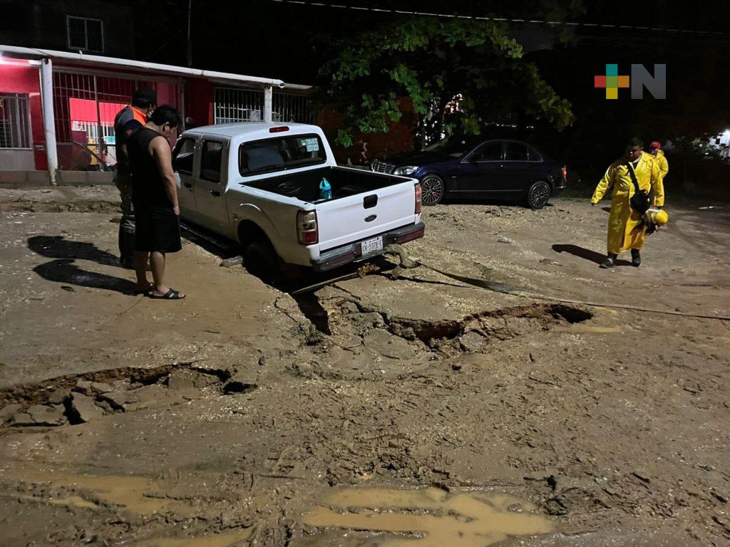 En la colonia Las Fuentes, una camioneta terminó atrapada en un socavón en la calle Río Coatzacoalcos, aunque bomberos intentaron sacar vehículo con la ayuda de la unidad de ataque rápido, no se pudo por el lodo.