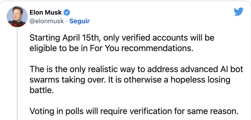 Redacción.- El propietario de la red social, Twitter; Elon Musk anunció que solamente las cuentas verificadas serán elegibles para aparecer en recomendaciones.