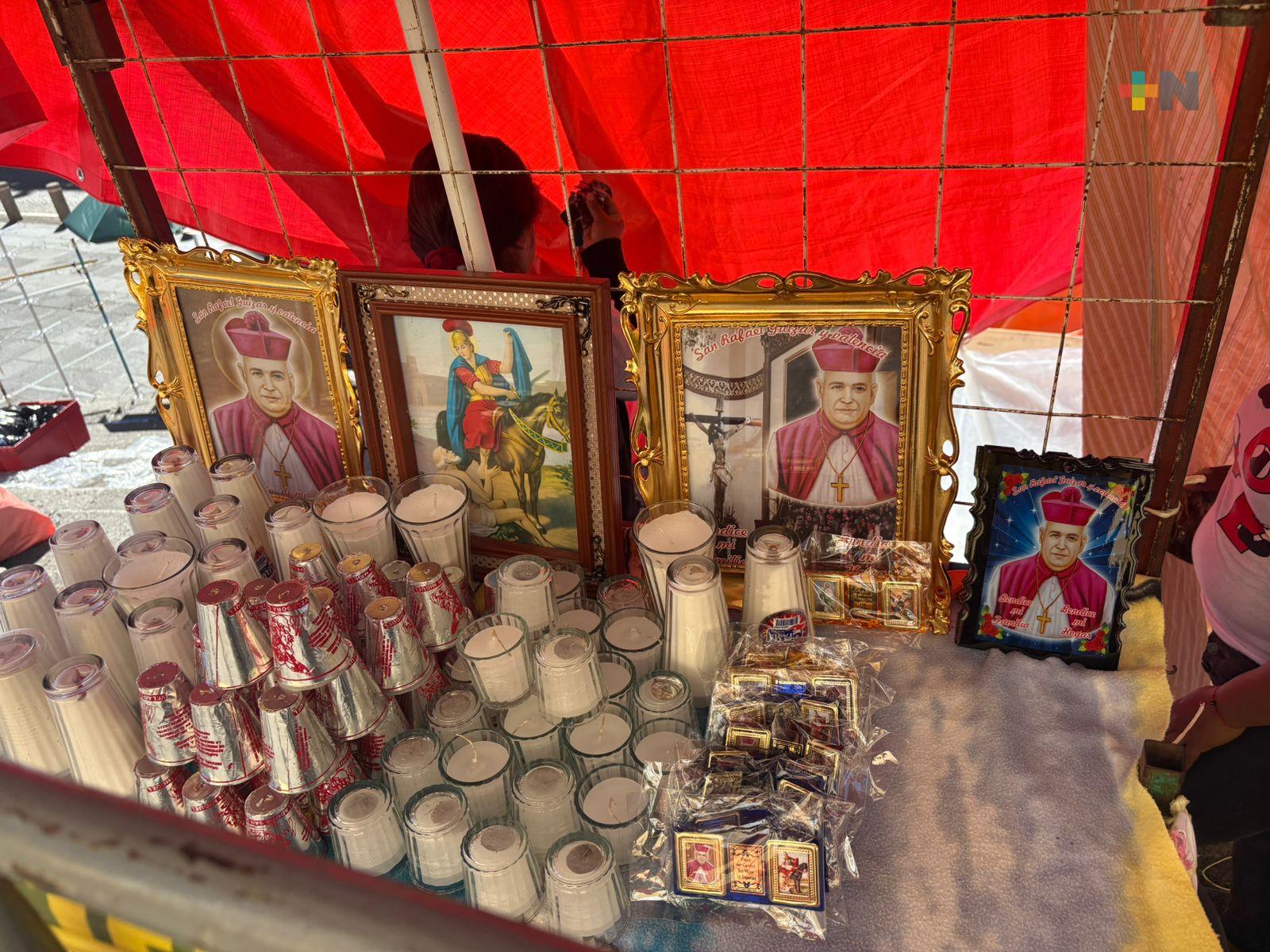 Xalapa, Ver.- Comerciantes ya se ubican en las escalinatas de la Catedral Metropolitana de Xalapa con el fin de ofrecer estampas, pan, playeras, rosarios, pulseras, cuadros de imágenes religiosas para feligreses que visitarán este espacio y celebrar a San Rafael Guízar y Valencia.