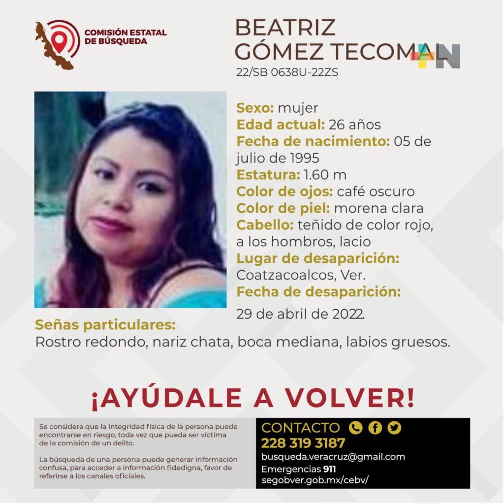 El mismo 29 de abril la Comisión Estatal activó una ficha para ubicar a Beatriz Gómez Tecomal de 26 años de edad.