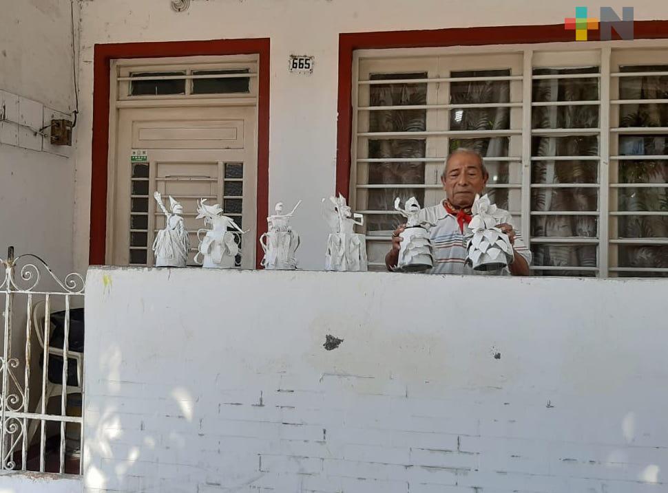 Obligado por la pandemia, Treviño de 82 años de edad, remplazó Las Atarazanas del Instituto Veracruzano de la Cultura (IVEC), su espacio laboral, por su pequeña morada en Juan Soto 665 en la ciudad de Veracruz, ahí va transformando el cartón con la ayuda del engrudo en figuras carnestolendas.