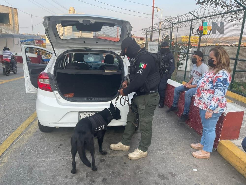 Coatzacoalcos, Ver.- La Secretaría de Seguridad Pública (SSP), a través de la Compañía K9 de la Fuerza Civil, en coordinación con la Secretaría de Marina (Semar), realizaron durante este fin de semana operativos aleatorios en la central de autobuses y en el transbordador para cruzar de Villa Allende a Coatzacoalcos.