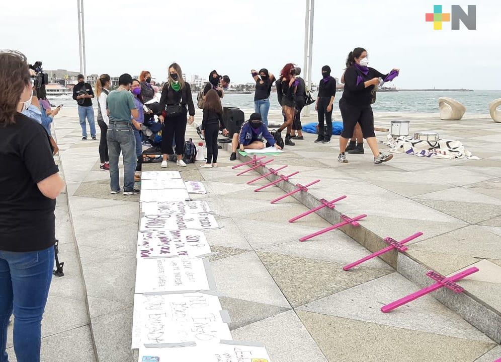 Con cruces de madera recuerdan a víctimas de feminicidio en asta bandera del puerto de Veracruz