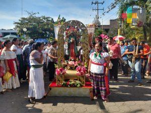 Ataviadas con faldas, blusas y rebosos las mujeres y los hombres vestidos de manta y sobrero, bailan y cantan diferentes sones entonados por la orquesta de música de viento “cultura y tradición”, durante de una procesión por la cabecera municipal.