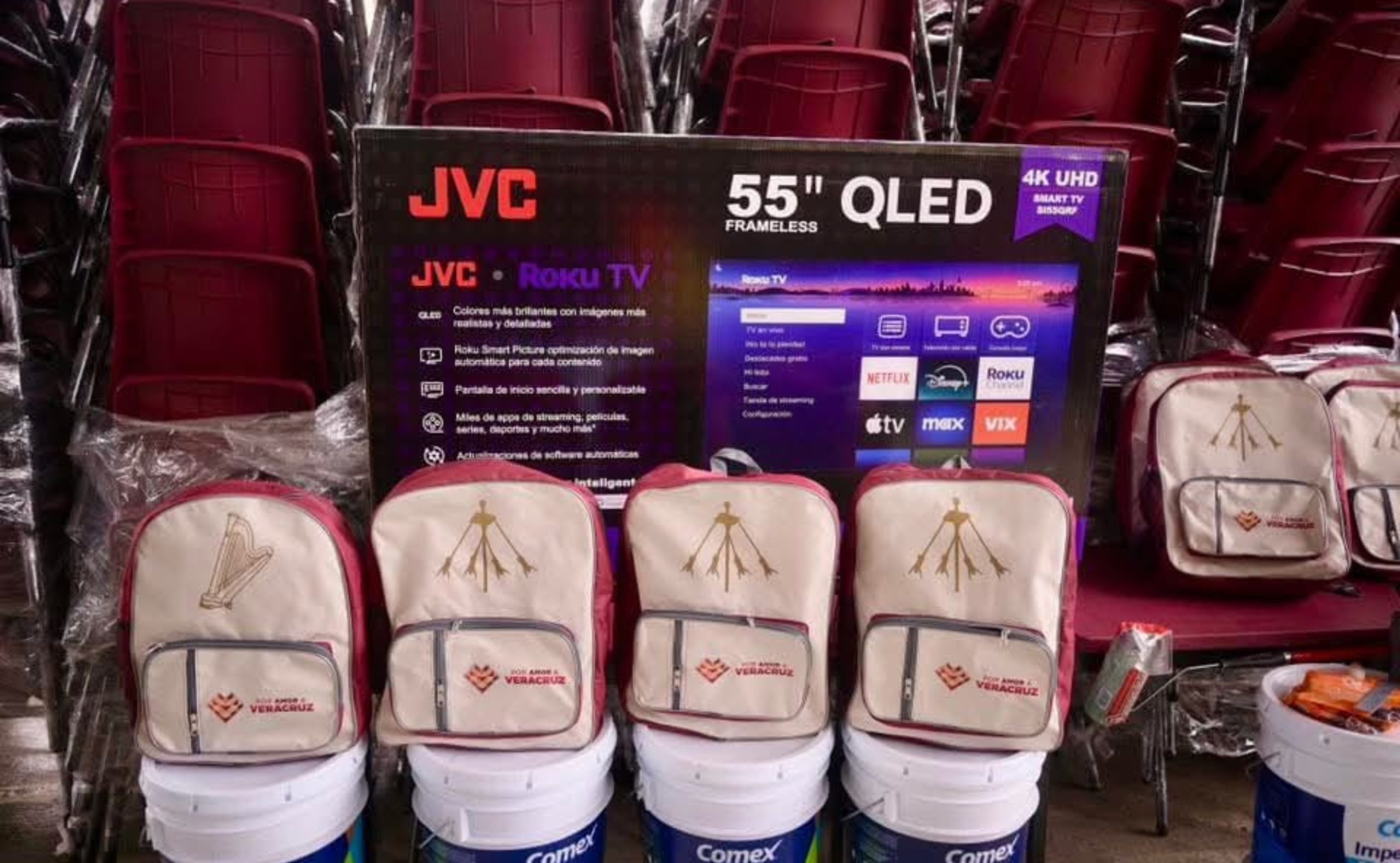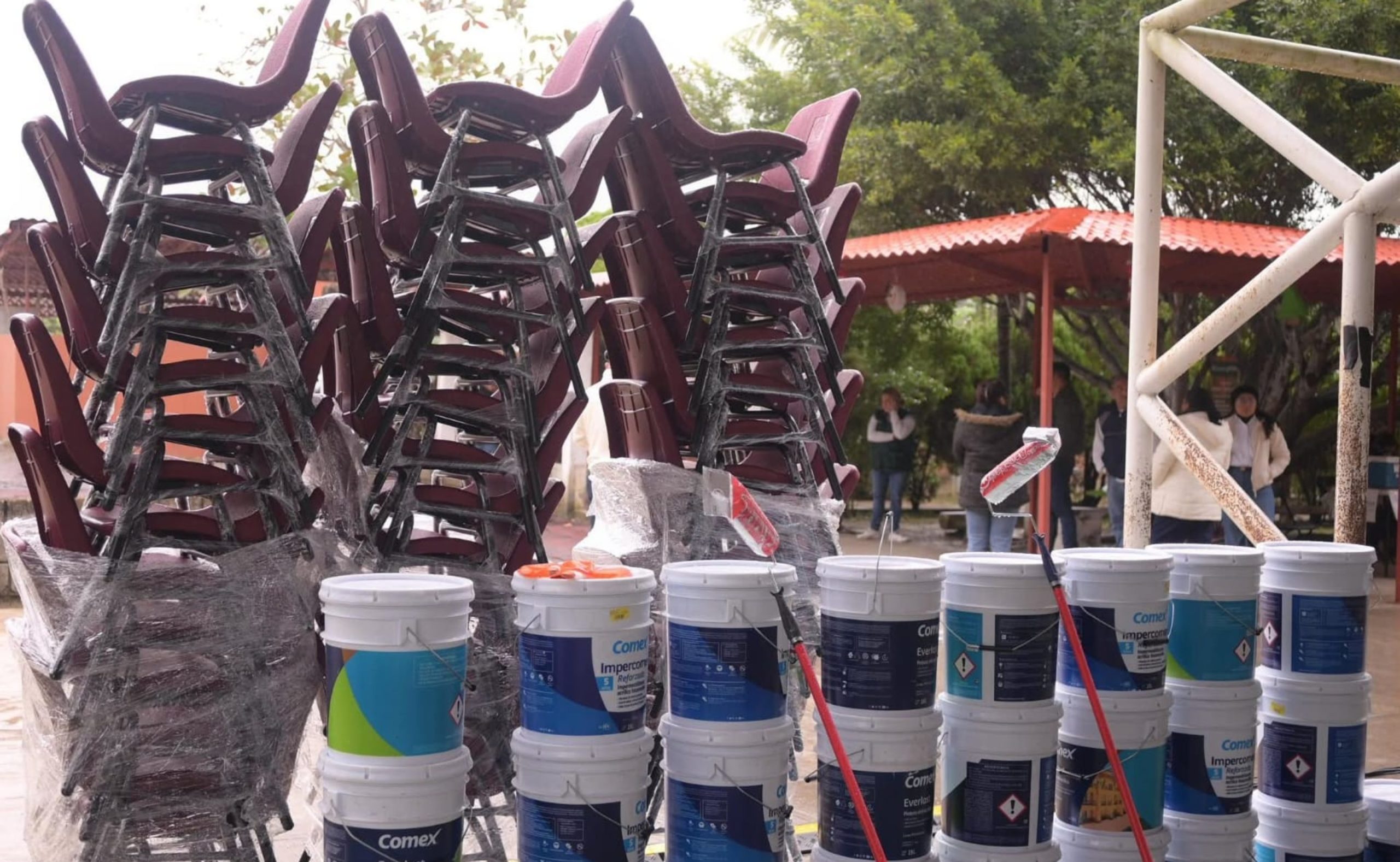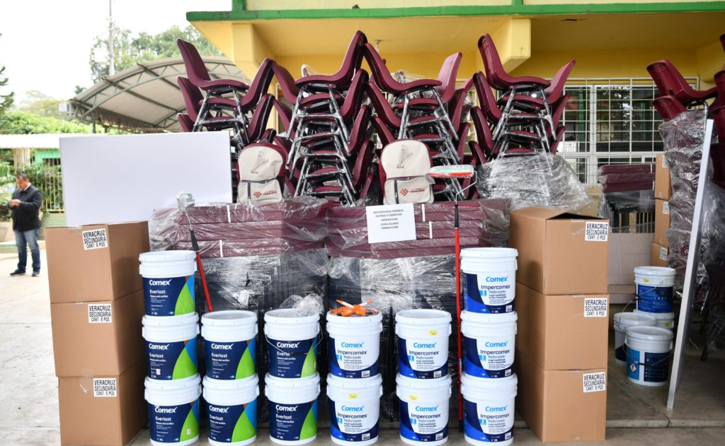 En total, 15 secundarias de Poza Rica recibieron 2 mil 257 kits escolares, mil 421 sillas, 710 mesas, 183 cubetas de impermeabilizante, 131 cubetas de pintura de 19 litros, 113 pizarrones, 47 pantallas de 55 pulgadas para 11 telesecundarias, así como 30 brochas y 30 rodillos, destinados al mejoramiento de las condiciones de los planteles.