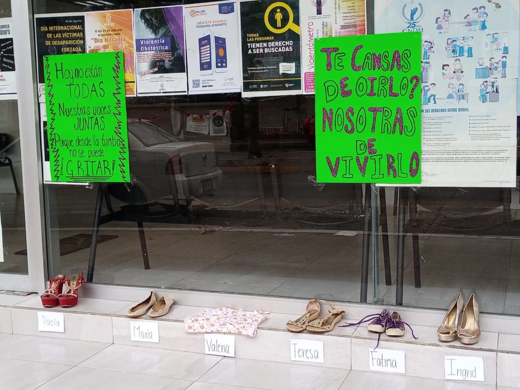 A causa de la pandemia por COVID-19 este año cambiaron la marcha por un acto simbólico en el que colocaron zapatos y prendas de vestir con el nombre de víctimas de feminicidios y de otro tipo de violencia, explicó Génesis Camacho.