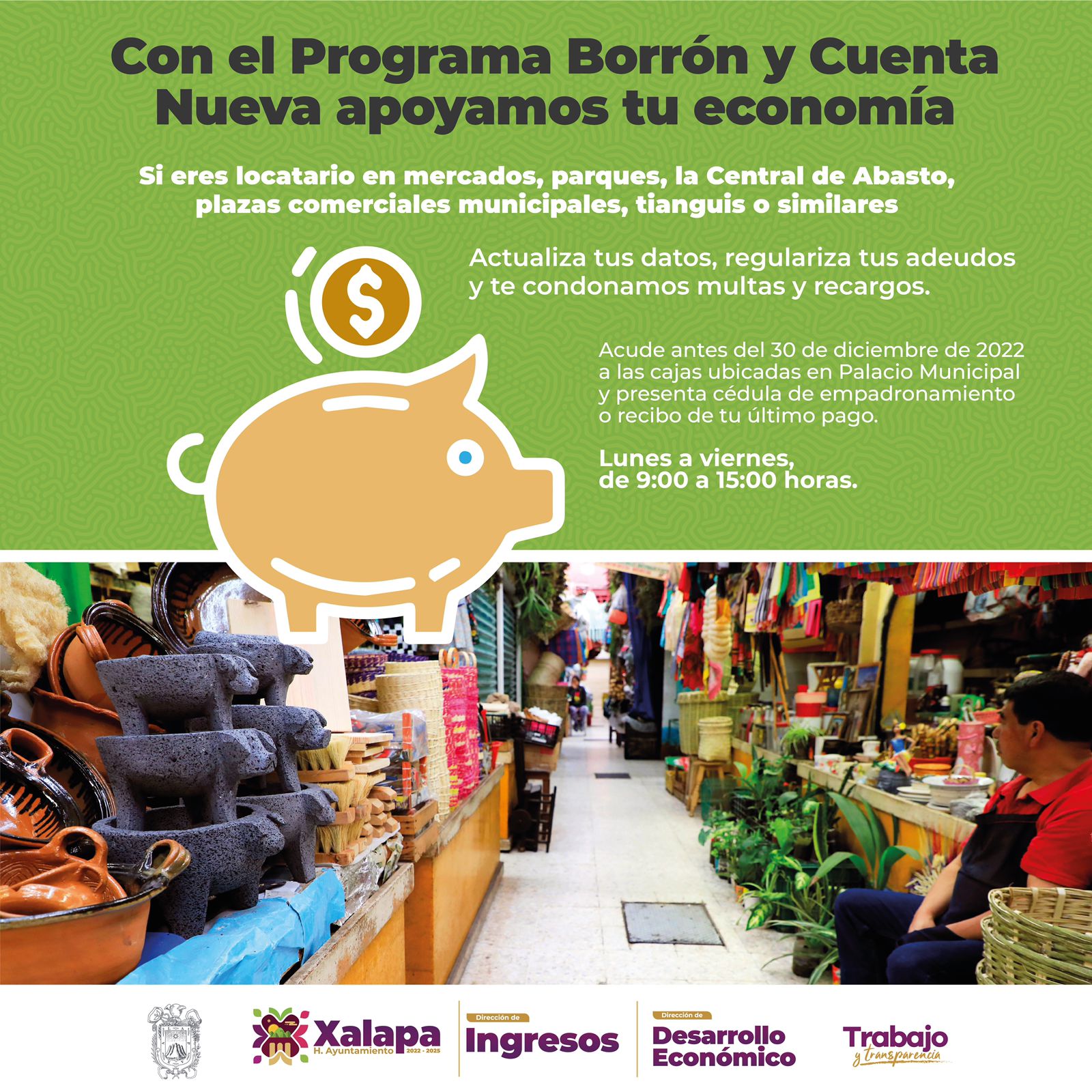 Por Acuerdo de Cabildo aprobado en mayo, se determinó que a través de esta iniciativa, se cancelarán multas y recargos a los locatarios que participen en el programa Borrón y Cuenta Nueva, mismo que inició en septiembre y concluirá el 30 de diciembre de 2022.