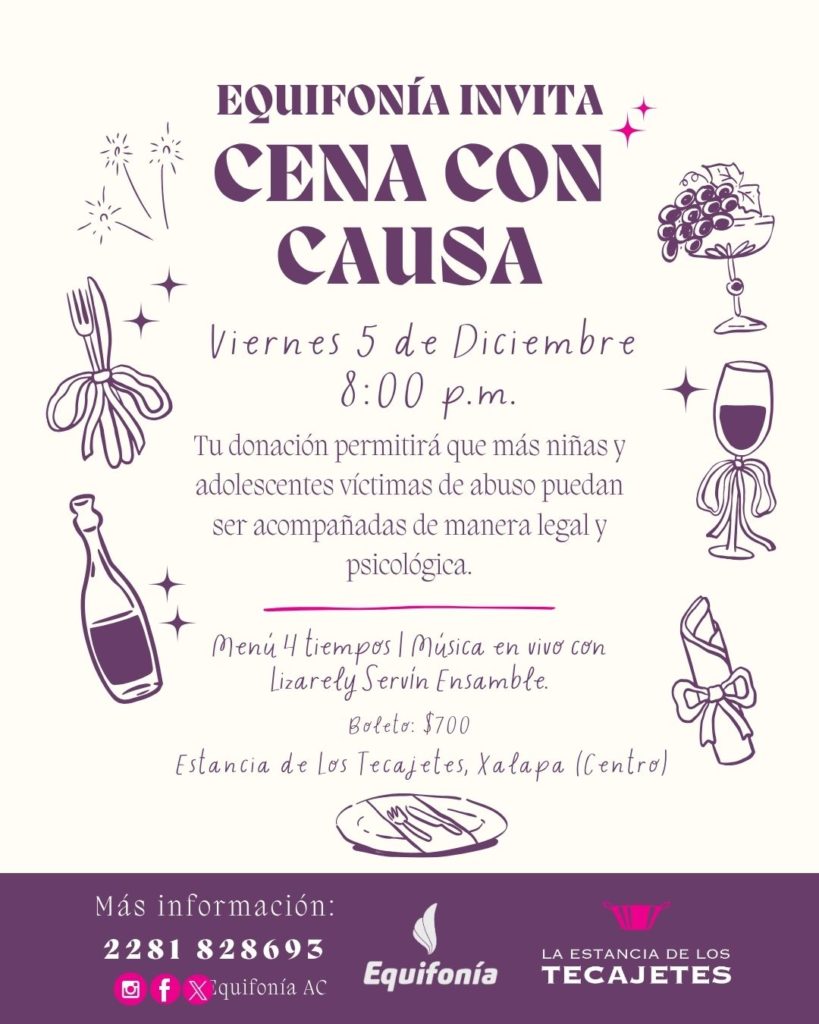 Equifonía es una asociación civil que cumple 15 años de trabajo ininterrumpido, brindando asesoría a familias de Veracruz en estos temas, por lo que requiere del apoyo de la sociedad civil para su funcionamiento. Por ello organizaron para el 5 de diciembre una cena con causa. Para más información los interesados pueden acudir a sus redes sociales.